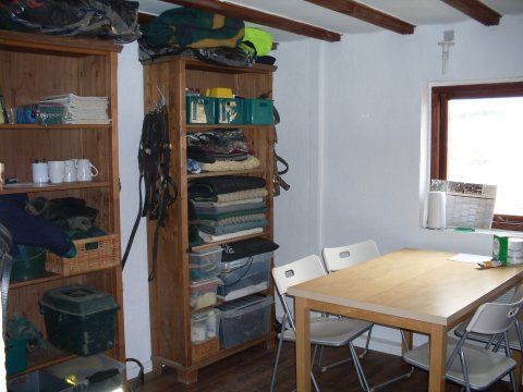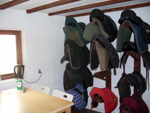 Hér opbevares sadler og hovedtøj godt og varmt - og fra vinduet i sadelrummet er det smukt udkig ud på markerne og vinterfoldene.